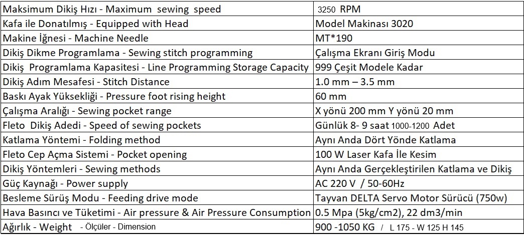 Yeni Bilgisayar Kontrollü Elektronik Programlı Servo Motorlu Özel Ayarlı Kalıp sistemi İle Parça Değişimi Olmadan Ekran Üzerinde Değerleri Girerek Otomatik Katlama ve Dikiş Kalıbı İle Çıma ve Köşe dikişleri Bitmiş LAZER Kesicili Tekli-Çiftli Fermuarlı,Cep Karşılık Takmalı Otomatik İplik Kesmeli Yarım Devir Büyük Çağnozlu Minumum Yağlamalı İşleme Dikiş Kafa Sistemli Cep Fleto Otomatı.